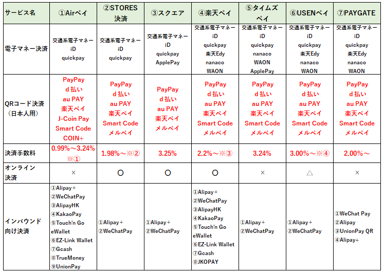 まずは、下記の表を見てください。スマホ決済の大手7社をまとめた表です。一番左が「Airペイ」です。